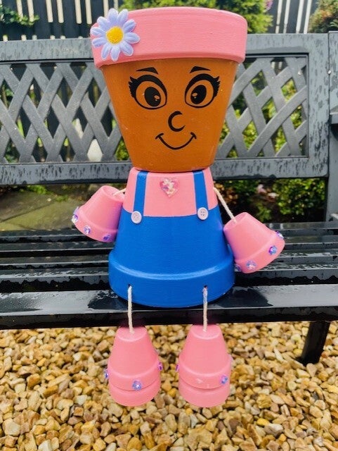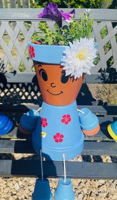 Each one is hand-painted with love, crafted from sturdy terracotta pots, and sealed for outdoor durability—so they’re ready to brave the Scottish weather with style! No two are alike: every Potty Person has its own quirky character, vibrant colours, and playful spirit. Approx 46cm tall (incl legs) 29cm wide (incl arms).